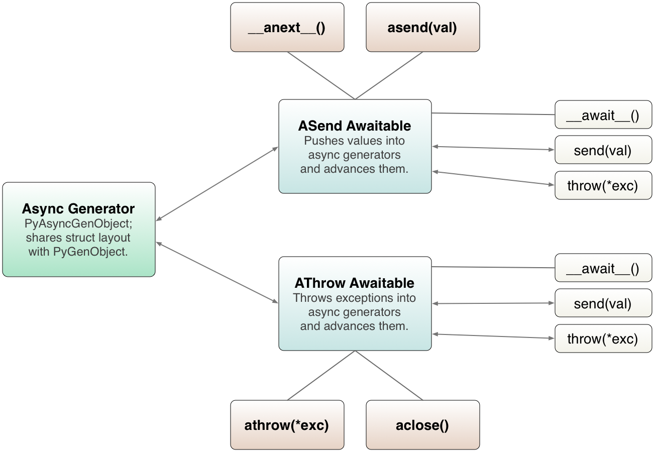 3. _PyAsyncGenWrappedValue: every directly yielded object from an asynchronous generator is implicitly boxed into this structure. This is how the generator implementation can separate objects that are yielded using regular iteration protocol from objects that are yielded using asynchronous iteration protocol.